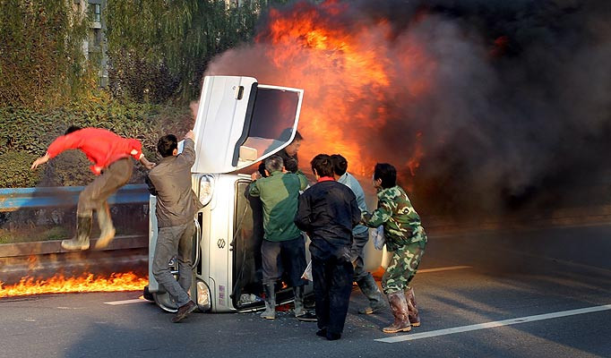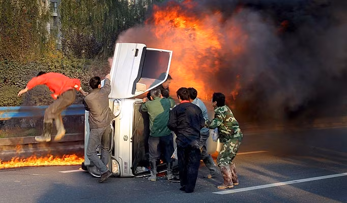 Chiếc xe tải bị lật nghiêng một cách bí ẩn sau khi khói bắt đầu phát ra từ dưới bộ khung. Người lái xe thoát ra đầu tiên sau đó ông đã giúp đưa từng người một thoát ra. Thật đáng kinh ngạc, không có một người lái xe nào dừng lại để giúp đỡ những người bị nạn dù lúc đó là giờ cao điểm buổi sáng ở Tây An, Trung Quốc.