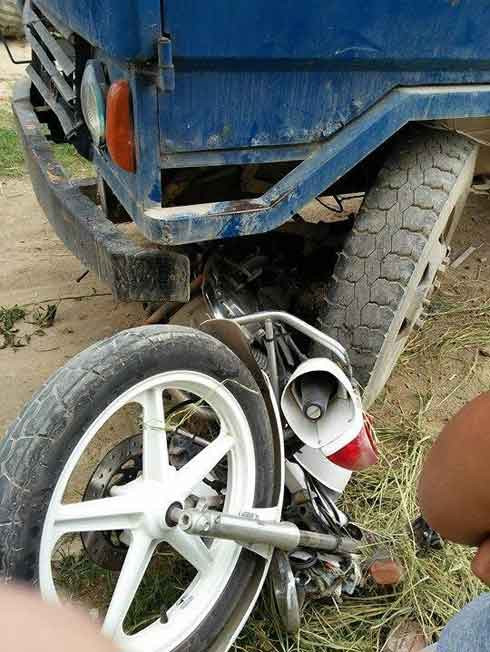 Chiếc xe máy chuyên dụng bị gẫy đôi sau khi bị xe tải tông trúng