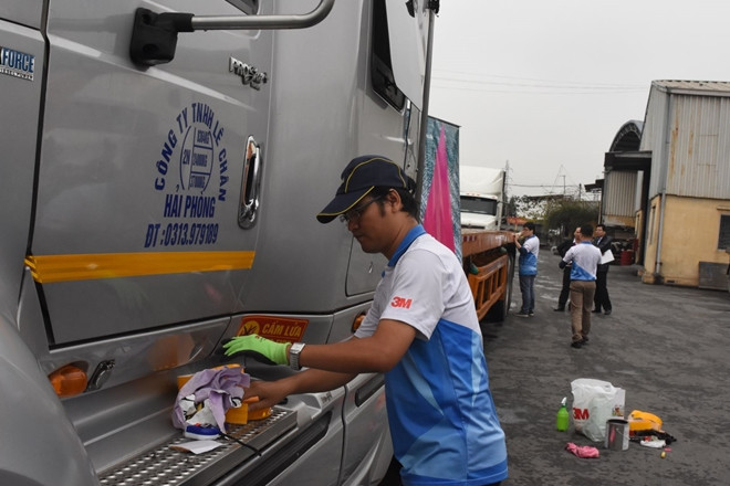 Thí điểm dán dải phản quang xe tải nặng ở Hải Phòng