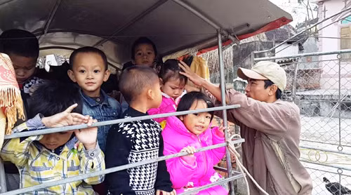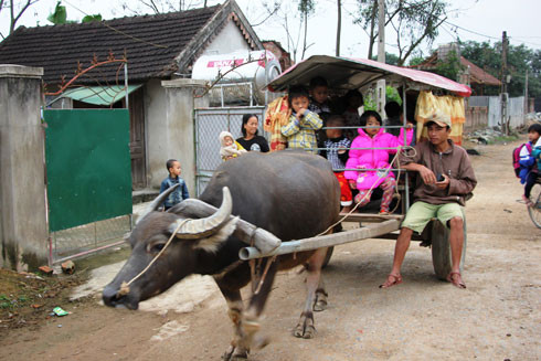 Các cháu trên chiếc xe trâu của anh Ngọc đến trường hàng ngày