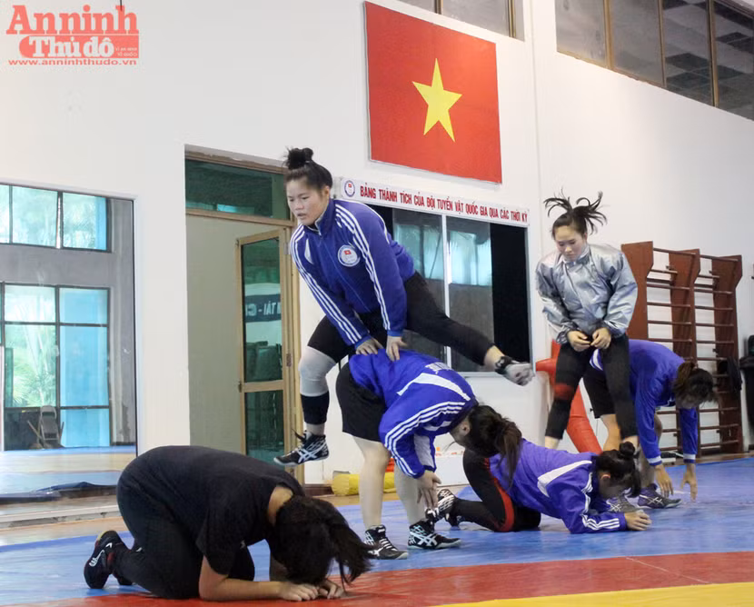Các VĐV tập các bài khởi động đặc thù của môn vật