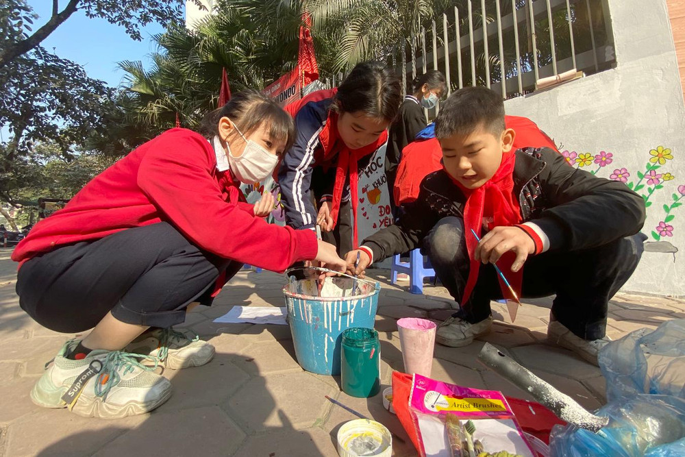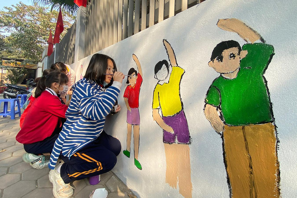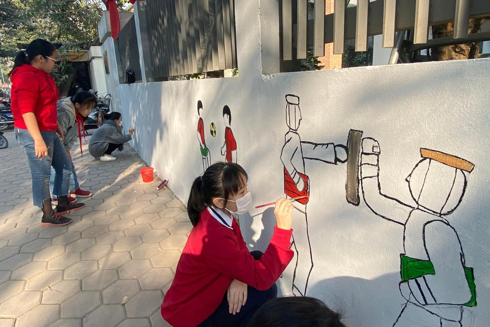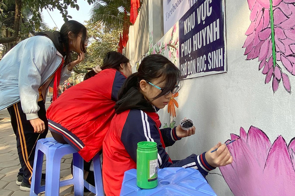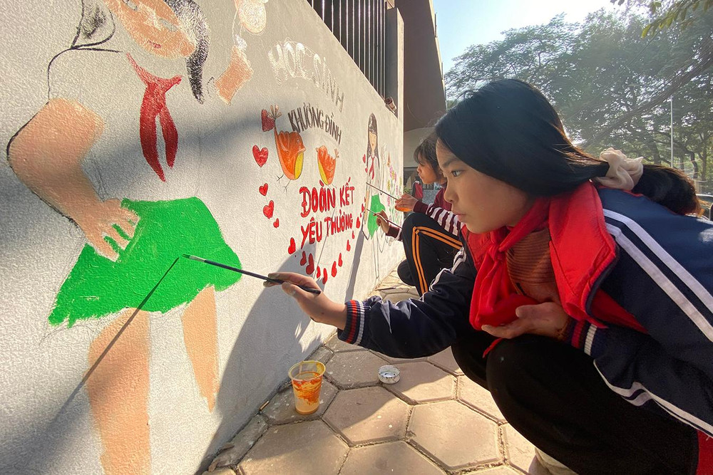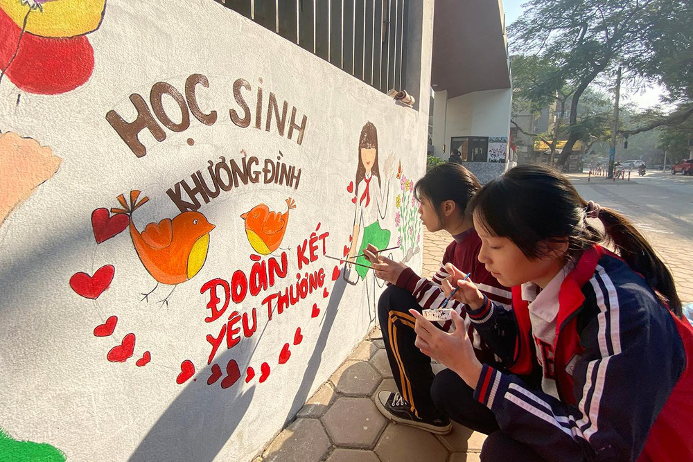ANTD.VN - Không phải do các họa sĩ chuyên nghiệp sáng tác, những bức bích họa đầy màu sắc, hình ảnh sinh động và có tính giáo dục cao đã được các em học sinh trường THCS Khương Đình (Thanh Xuân, Hà Nội) vẽ lên thay thế cho màu sắc đơn điệu của bức tường bên ngoài trường học.