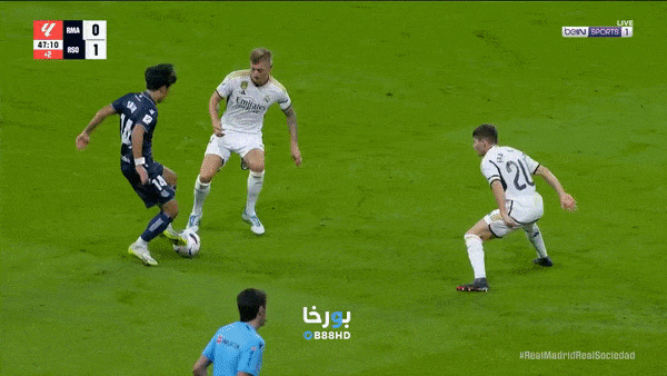 ANTD.VN - Tiền vệ người Nhật Bản - Takefusa Kubo thực hiện động tác kỹ thuật, "xỏ kim" ngôi sao trứ danh Toni Kroos trước khi bị phạm lỗi, ở trận Real Madrid 2-1 Sociedad rạng sáng 18-9, tại vòng 5 La Liga 2023/24.