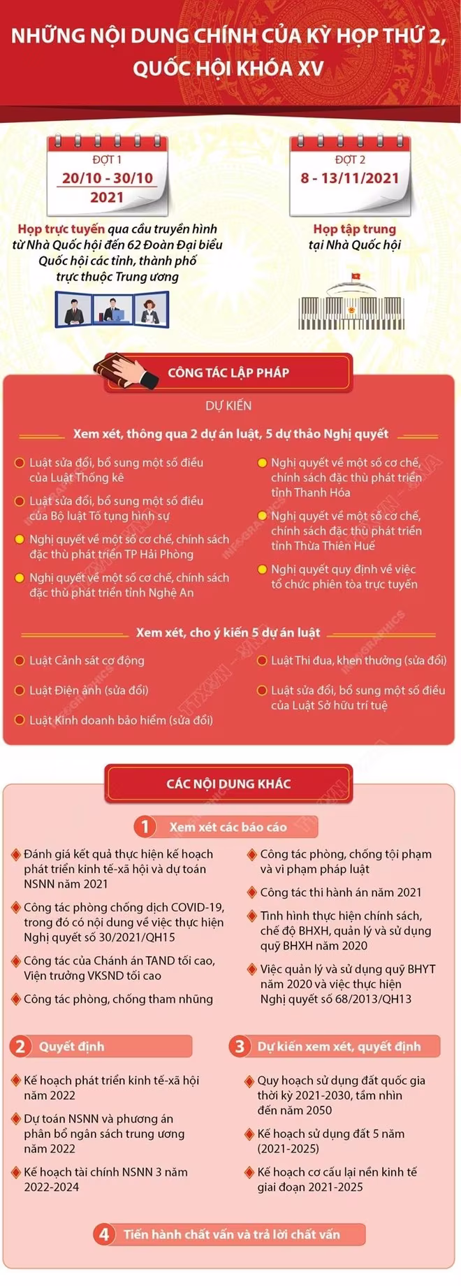 - Thứ nhất, Quốc hội sẽ xem xét, thông qua 2 dự án Luật, 5 dự thảo Nghị quyết và cho ý kiến 5 dự án Luật, gồm Luật Thi đua, khen thưởng (sửa đổi); Luật sửa đổi, bổ sung một số điều của Bộ luật Tố tụng hình sự; Luật Cảnh sát cơ động; Luật Điện ảnh (sửa đổi); Luật sửa đổi, bổ sung một số điều của Luật Sở hữu trí tuệ; Luật sửa đổi, bổ sung một số điều của Luật Thống kê; Luật Kinh doanh bảo hiểm (sửa đổi); Nghị quyết quy định việc tổ chức phiên tòa trực tuyến; Nghị quyết về một số cơ chế, chính sách đặc thù phát triển các tỉnh Thanh Hóa, Nghệ An, Thừa Thiên - Huế, TP Hải Phòng và xem xét, ban hành Nghị quyết chung Kỳ họp thứ 2, Quốc hội khóa XV.