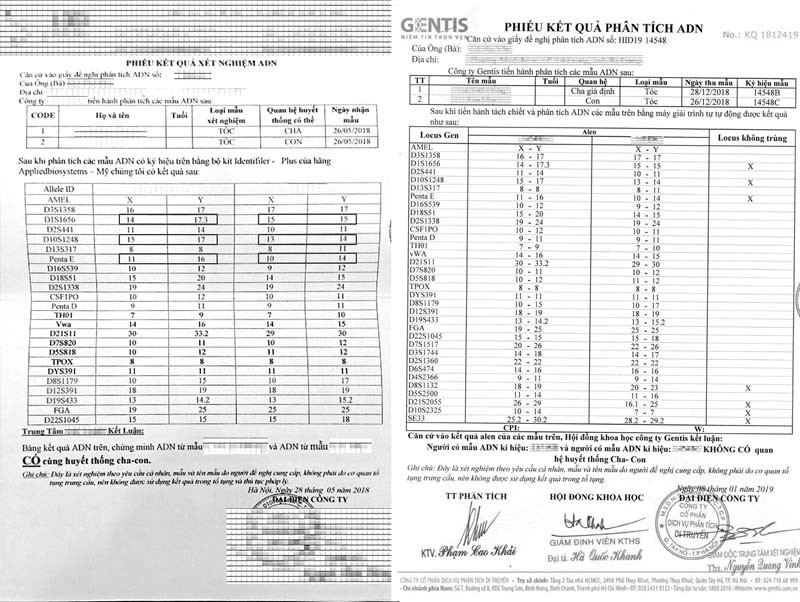Anh N.V.A nghi ngờ về kết quả và tiếp tục gửi mẫu đến Gentis để phân tích lại. Tại Gentis, mẫu được phân tích bằng bộ kit mở rộng với 33 locus gen. Kết quả: Có thêm 4 locus sai khác giữa bố và con. Kết luận chính xác cuối cùng: Người cha và người con hoàn toàn không có quan hệ huyết thống.