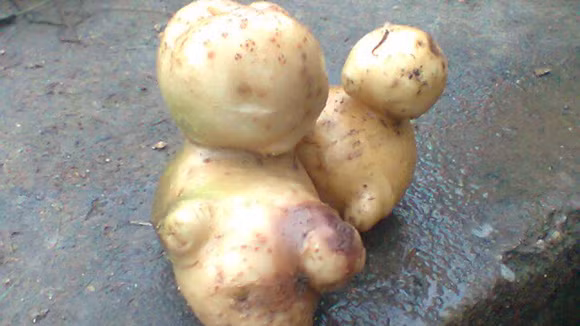 Theo quan sát, củ khoai nặng khoảng 0,3 kg có hình dạng giống hệt như 2 mẹ con đang ngắm nhìn nhau. Đặc biệt, 2 phần trên của củ khoai thì tách rời nhau ra nhưng phía bên dưới lại dính vào nhau. Phía trên của củ khoai có hình dáng giống như 2 mặt người. Phần giữa củ khoai lại có 2 cánh tay chìa ra.
