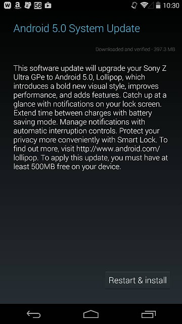 Trên một số trang mạng rò rỉ hình ảnh cho thấy Xperia Z Ultra GPe (Google Play Edition) đã cập nhật Android 5.0 từ hơn một tháng nay và thậm chí có thông tin cho rằng trước đó Sony đã xây dựng các bản thử nghiệm AOSP Lollipop trên các thiết bị Xperia Z1, Z2 và Z3.