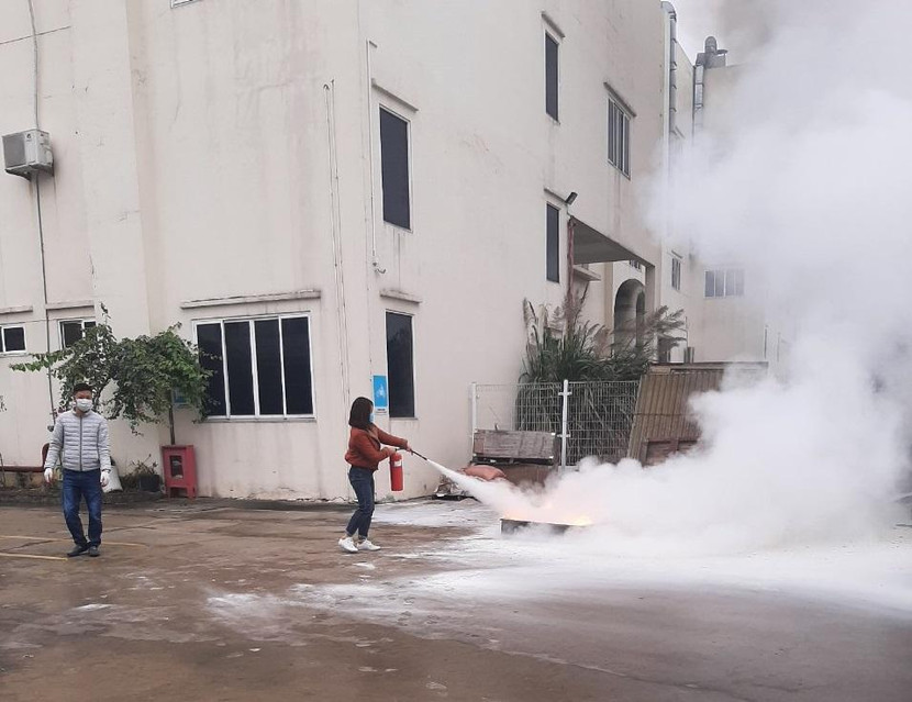 Với tình huống giả định xảy cháy do chập điện tại khu xưởng sản xuất nơi có nhiều hàng hóa, bìa giấy, máy móc..., ngay khi phát hiện cháy, lực lượng chữa cháy cơ sở đã khẩn trương tổ chức dập lửa, hướng dẫn công nhân thoát nạn ra ngoài.