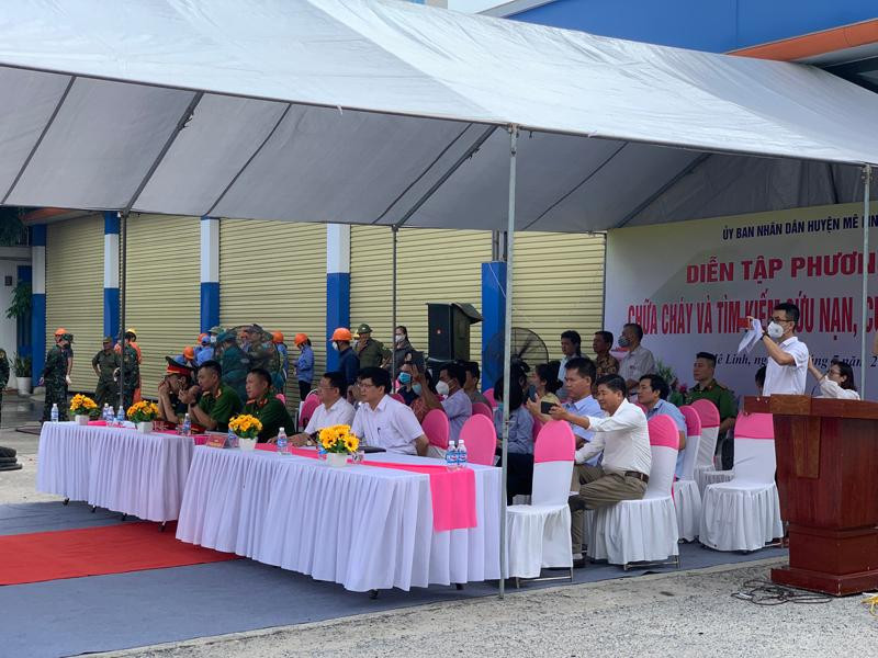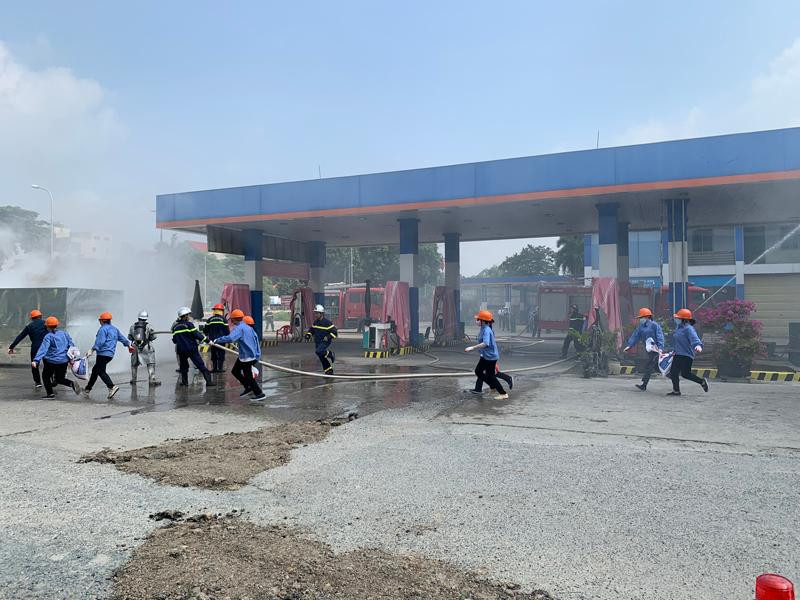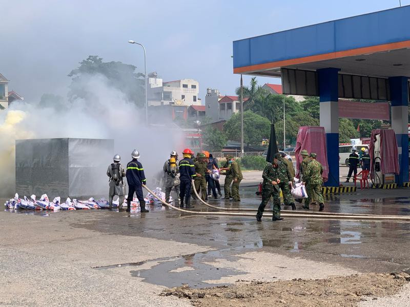 ANTD.VN - UBND huyện Mê Linh, Hà Nội vừa tổ chức diễn tập thành công phương án chữa cháy và tìm kiếm cứu nạn, cứu hộ có huy động nhiều lực lượng tại cửa hàng xăng dầu Nhật Huy, thị trấn Quang Minh.