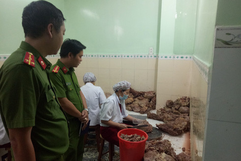 Cảnh sát điều tra tội phạm về kinh tế Công an Tp Quảng Ngãi kiểm tra cơ sở chuyên chế biến thịt bò khô Thu Ba, trên đường Nguyễn Nghiêm. Đây là một trong những cơ sở chế biến thịt bò khô lớn ở TP Quảng Ngãi, trung bình mỗi ngày cung cấp khoảng 200 đến 300 kg thịt bò khô ra thị trường. Chính vậy, việc tăng cường kiểm tra, kiểm soát về an toàn thực phẩm của lực lượng Công an đối với cơ sở này là điều rất cần thiết.