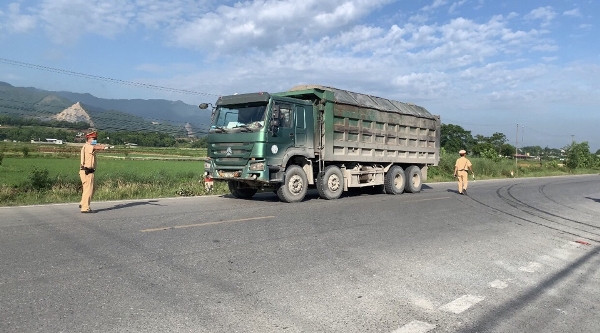 Dưới cái nắng nóng gay gắt, tổ công tác của Đại úy Trần Mạnh Quyết đã dừng xe kiểm tra các lái xe tải có dấu hiệu vi phạm trên đường mòn Hồ Chí Minh. Quá trình kiểm tra, CSGT đã phát hiện nhiều lái xe vi phạm như không che chắn để rơi vãi vật liệu trên đường. Đối với những lái xe này, CSGT đều lập biên bản xử phạt, đồng thời gửi thông báo yêu cầu chủ phương tiện cam kết không tái phạm.