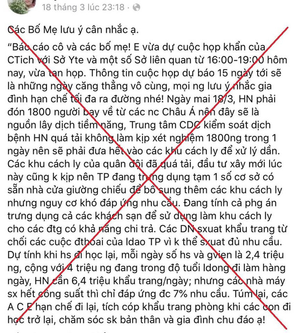 Các tài khoản này đăng tải thông tin nêu lên bối cảnh Hà Nội sắp “vỡ trận” trước diễn biến phức tạp của dịch Covid-19. Để khẳng thông tin này, chủ tài khoản còn đưa ra việc vừa dự họp cùng lãnh đạo thành phố khiến nhiều người dân hoang mang, lo lắng.