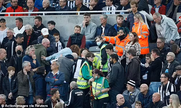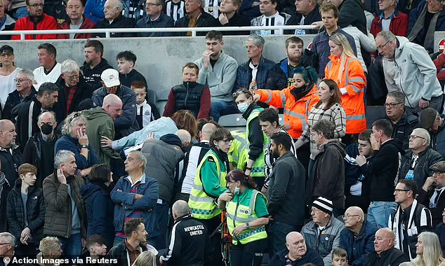 | Bác sĩ của Newcastle lập tức lên khán đài sơ cứu cho CĐV thiếu may mắn |