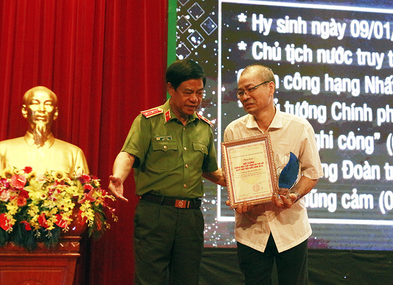 Trung tướng Đoàn Duy Khương, Giám đốc CATP Hà Nội trao chứng nhận truy tặng Giải thưởng “Gương mặt trẻ Công an Thủ đô xuất sắc tiêu biểu” với liệt sỹ Đại úy Phạm Công Huy
