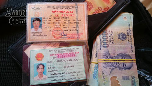 Kiểm tra bên trong túi có một bọc tiền và chiếc ví màu nâu cùng giấy tờ tuỳ thân mang tên Hoàng Văn Đức (SN 1989 ở Tiên Dương, Đông Anh, Hà Nội).