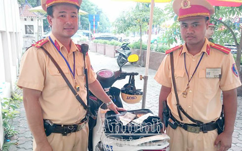 Khoảng 10h5 sáng nay 9-9, trên đường ra thay ca trực tại cổng BV Xanh Pôn ngã tư Trần Phú - Chu Văn An, tổ công tác Đội CSGT số 2,Phòng CSGT đường bộ - đường sắt, CATP Hà Nội do Đại uý Đào Bảo Ngọc và Thiếu uý Đoàn Văn Tú làm nhiệm vụ đã nhặt được chiếc cặp màu đen của người dân đánh rơi ở ven đường.