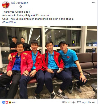 Trang trang mạng cá nhân, tiền vệ Duy Mạnh đăng bức ảnh chụp cùng thầy Bae kèm theo chia sẻ: "Anh em cầu thủ nợ thầy một lời cảm ơn!"
