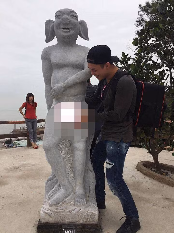 Du khách tạo dáng phản cảm bên một bức tượng gây tranh cãi tại Khu du lịch quốc tế Hòn Dấu