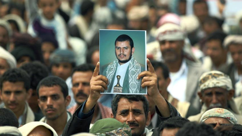 Người dân giơ cao bức ảnh chụp thủ lĩnh phiến quân Houthi ở Yemen Abdel Malek al-Huthi