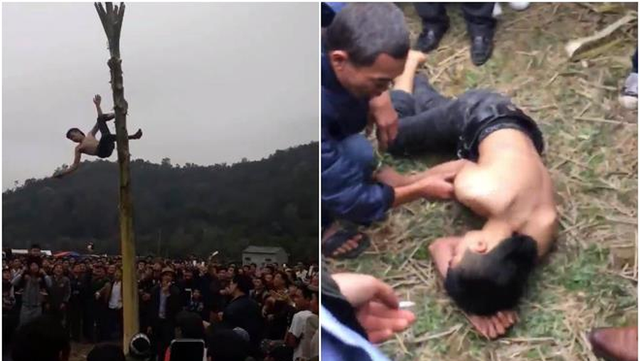 Trước đó, trên mạng xã hội lan truyền đoạn clip ghi lại cảnh một nam thanh niên cởi trần vắt vẻo ở trên ngọn một cây chuối (chỉ còn độc một thân cây thẳng tắp và cao chót vót), phía dưới có rất đông người vây xung quanh. Nam thanh niên này đang tìm cách lấy một thứ gì đó được gắn chặt ở đỉnh cây thì bất ngờ rơi xuống đất ở độ cao ước chừng 5m.