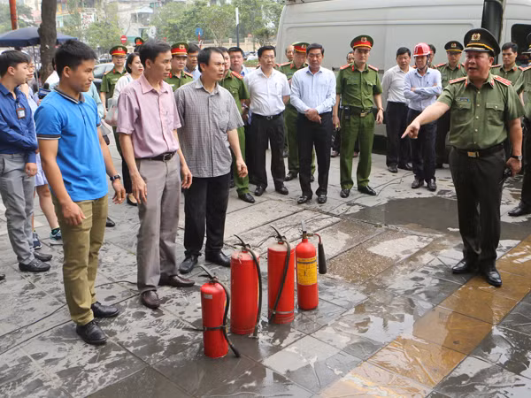 Kiểm tra xác xuất một số bình chữa cháy xách tay được trang bị tại các sảnh của tòa nhà đều mất tác dụng. Đoàn công tác tiến hành kiểm tra tòa nhà M5 phố Nguyễn Chí Thanh, ghi nhận nơi đây các hệ thống an toàn PCCC đầy đủ, phát huy tác dụng. Tuy nhiên, đồng chí Thứ trưởng lưu ý mặc dù thiết bị an toàn PCCC đầy đủ, hoạt động tốt song công tác tập huấn nâng cao trách nhiệm, ý thức người dân cần phải được thực hiện thường xuyên, liên tục.