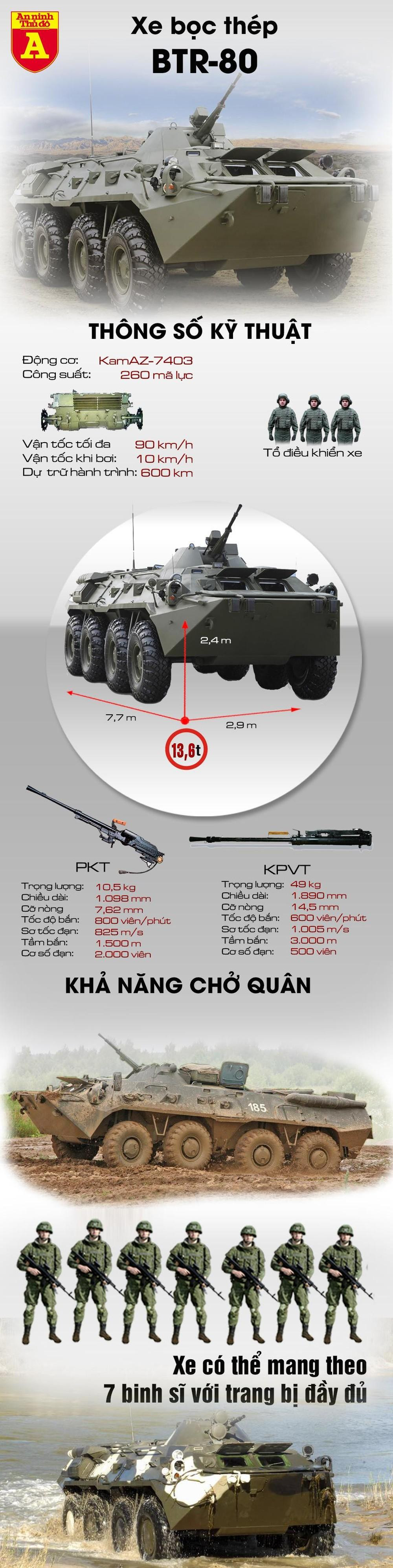 BTR-80 là một loại xe bọc thép chở quân bánh lốp 8x8 được Liên Xô thiết kế để hỗ trợ hỏa lực và vận chuyển lính chiến đấu tới trận địa. Loại xe này được bắt đầu sản xuất vào năm 1986 để thay thế các loại BTR trước đây.