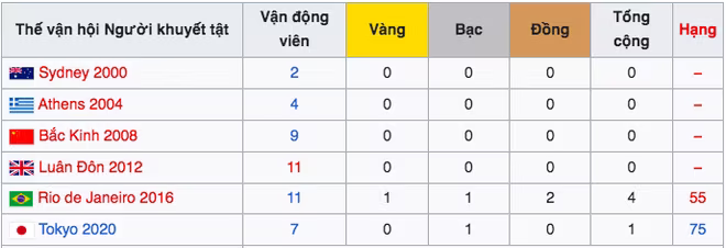 Thể thao người khuyết tật Việt Nam tham dự Paralympic lần đầu tiên tại Sydney - Australia năm 2000, trải qua 6 kỳ đại hội với tổng cộng 44 lượt VĐV tham gia tranh tài, chúng ta giành 1 HCV, 2 HCB và 2 HCĐ.