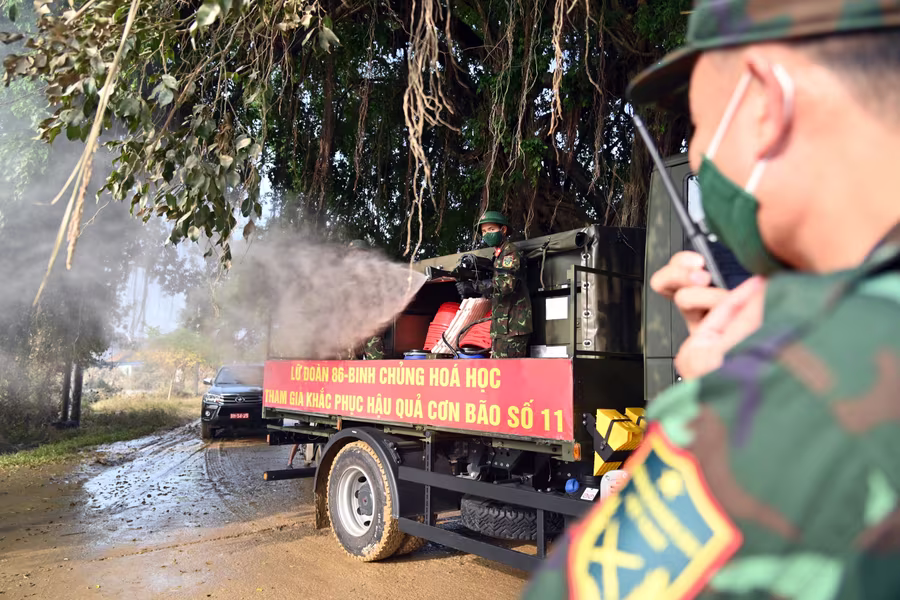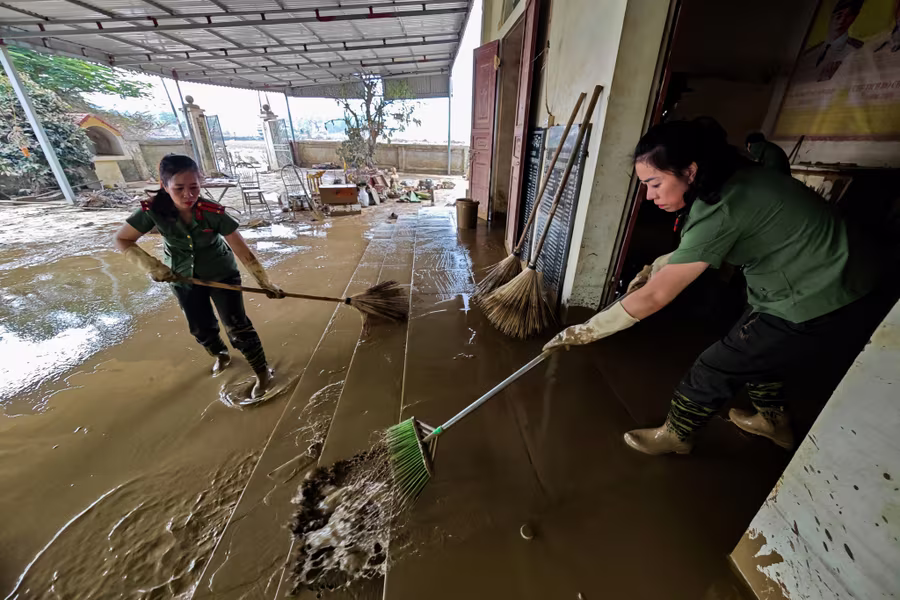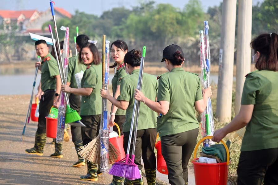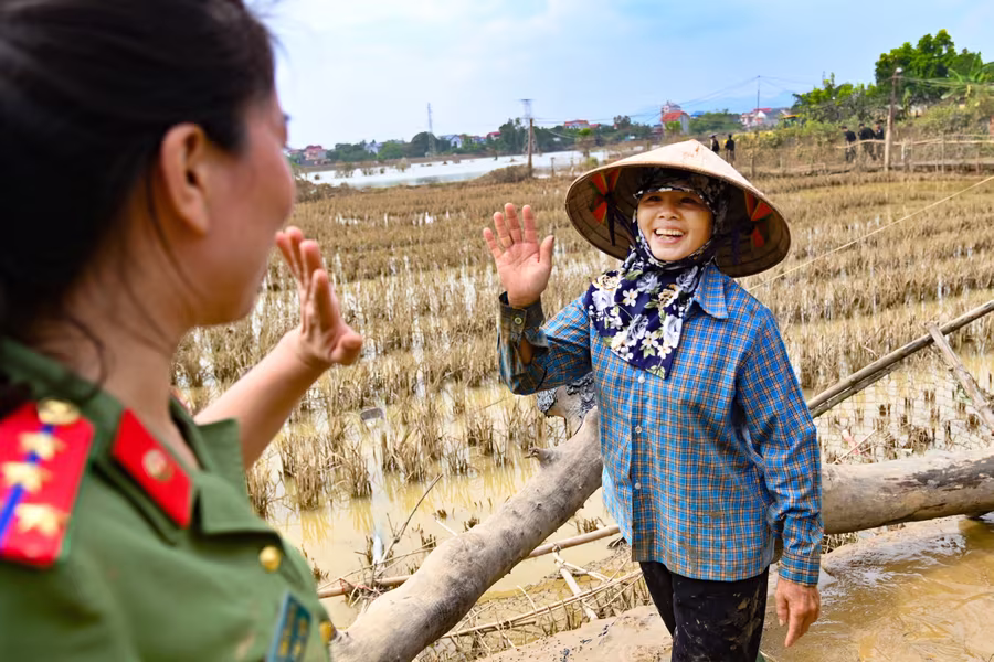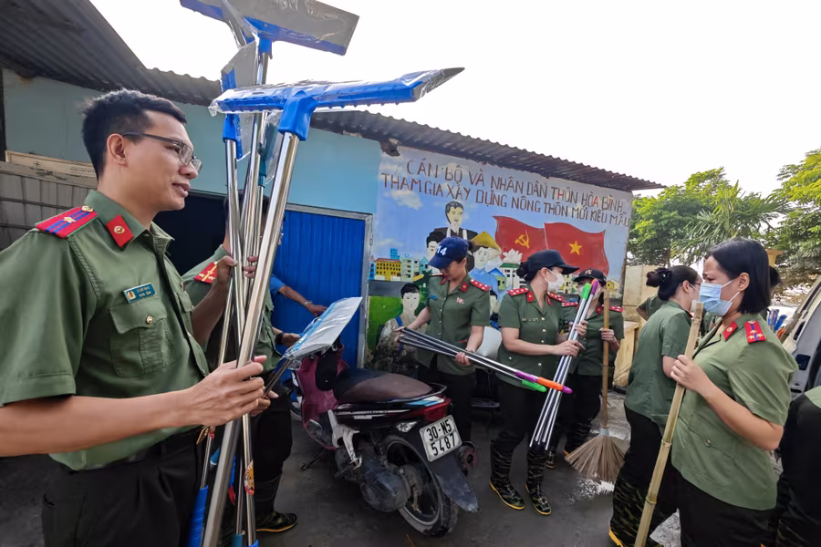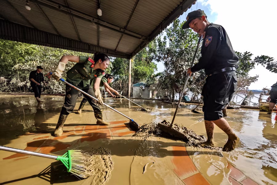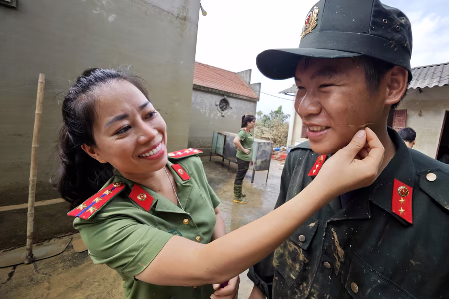 Hình ảnh xúc động khi hàng trăm cán bộ, chiến sỹ Công an Thủ đô dọn dẹp sau ngập lụt giúp người dân xã Trung Giã