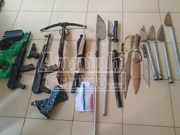 Súng, đạn, dao, kiếm được thu giữ tại nơi ở của Mai Vũ Long và Hoàng Quốc Hùng
