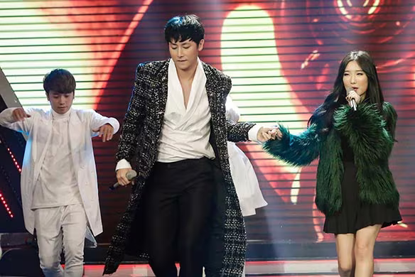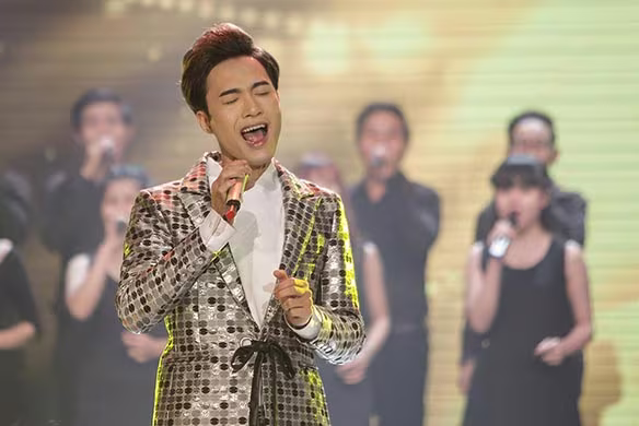 Thí sinh Lục Huy và ca sĩ Thu Minh trên sân khấu