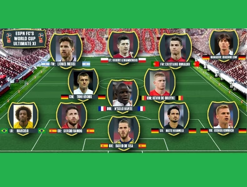 ANTD.VN - ESPN vừa công bố đội hình kết tinh của World Cup 2018 do các chuyên gia và người theo dõi họ bầu chọn, với sự có mặt của De Gea, Ramos, Ronaldo, Messi và hàng loạt cái tên đình đám khác.