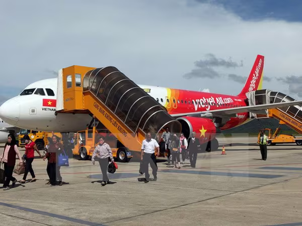 Máy bay của Vietjet Air trả khách tại sân bay Liên Khương, tỉnh Lâm Đồng