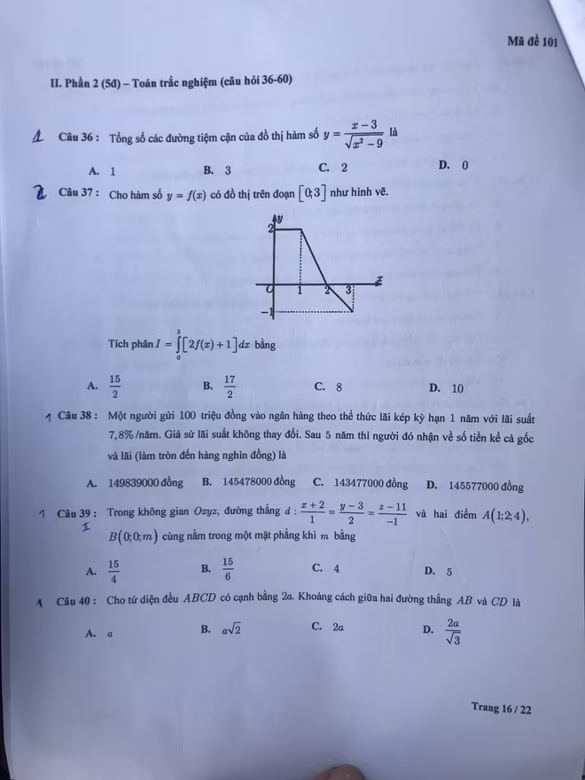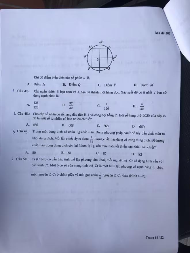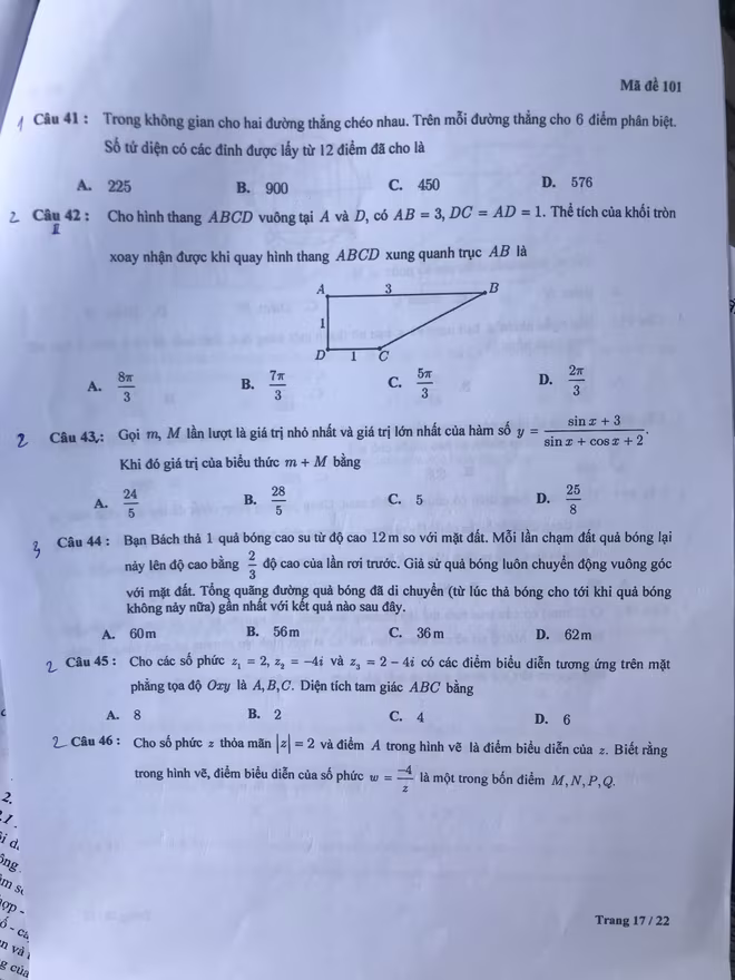 · Phần trắc nghiệm: Bao gồm 25 câu từ câu 36-60 phủ đều 3 cấp độ, trong đó có khoảng 6 câu vận dụng cao chiếm 24%; 8 câu vận dụng chiếm 32%, 11 câu thông hiểu chiếm 44%. Các câu trắc nghiệm đều thuộc các dạng câu hỏi quen thuộc trong các kì thi thử và thi TNTHPT và bao phủ các chủ đề như đề cương đã công bố. Phần kiến thức lớp 11 có 8 câu chiếm 32%, chủ yếu tập trung vào phần Tổ hợp - Xác suất, Cấp số cộng - Cấp số nhân, Hình không gian và Lượng giác. Phần kiến thức lớp 12 chiếm 68%, quét tất cả các chuyên đề lớp 12. Các câu trắc nghiệm ở các mã đề khác nhau chỉ đảo vị trí