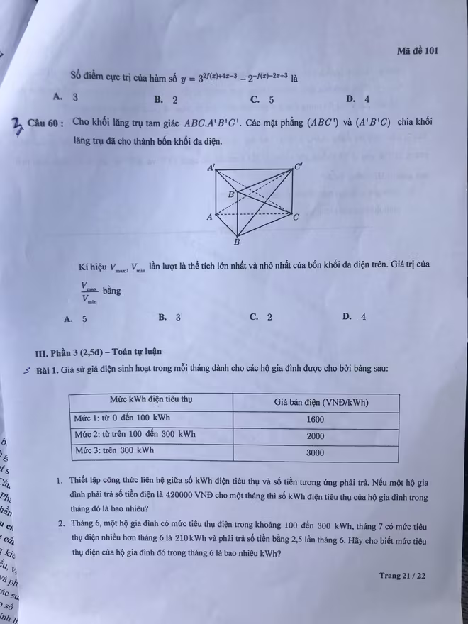 · Phần tự luận: Chiếm 2,5 điểm, trong đó có 2 câu hỏi: 1 câu hỏi thực tế liên quan tới bài toán giá điện với 3 ý và 1 câu hỏi hình học không gian cổ điển với 2 ý hỏi. Như vậy, mỗi ý sẽ chiếm 0,5 điểm.