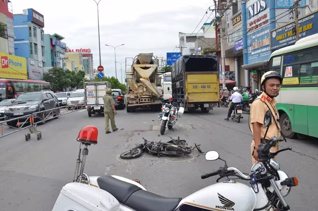 Tại hiện trường, xe máy bị xe bồn cán qua hư hỏng hoàn toàn. Vụ việc khiến dòng phương tiện di chuyển qua đây gặp nhiều khó khăn.