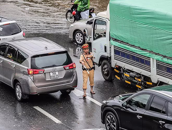 Chiến sỹ Cảnh sát giao thông phân luồng ô tô giữa vùng ngập