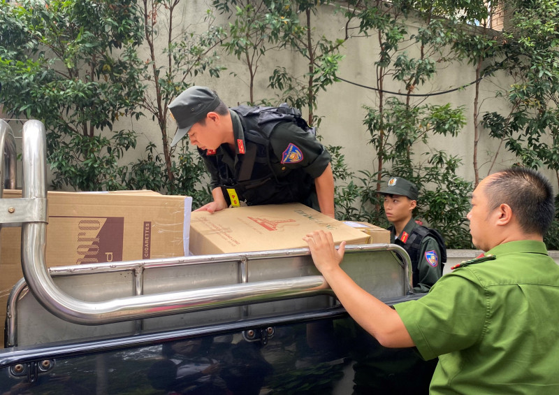 Chiều 19/7, hàng chục thùng giấy cỡ lớn và két sắt đã được Cảnh sát dán niêm phong, vận chuyển từ trong nhà bà Nguyễn Thị Như Loan ra ngoài chuyển lên xe chuyên dụng chở đi.
