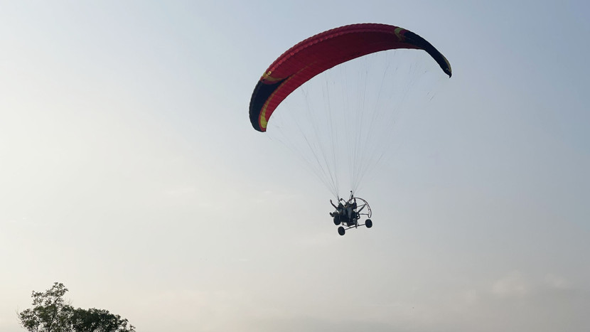 Đang ở độ cao khoảng 500m so với mặt sông Hồng, tiếng động cơ hai thì của dù máy đang rền vang bỗng im bặt… Như cảm nhận được sự lo lắng của tôi, chàng phi công dù lượn đầy kinh nghiệm vội nói lớn: “Anh yên tâm, chỉ là giảm hết ga để cảm nhận đất trời, nắng gió và cảnh quan phía dưới thôi”. Thả một chút, Hào Huy vít ga tăng tốc động cơ và điều khiển dù “đánh võng”, rồi hạ khá thấp trên mặt sông Hồng. Một cảm giác thật lạ, chiếc dù lượn tựa hồ như con chuồn chuồn từ trên cao lướt xuống gần mặt nước rồi vút lên, bay về phía cầu Nhật Tân, rồi vòng sâu vào khu vực đất bãi ven sông Hồng, thuộc địa phận xã Hải Bối, Đông Anh. Chiếc dù lượn như lướt trên những ngọn lá chuối mỡ màng, xanh mướt, trước khi lấy lại độ cao và vị trí thuận lợi để hạ cánh trong vỡ òa cảm xúc. Mới. Lạ...