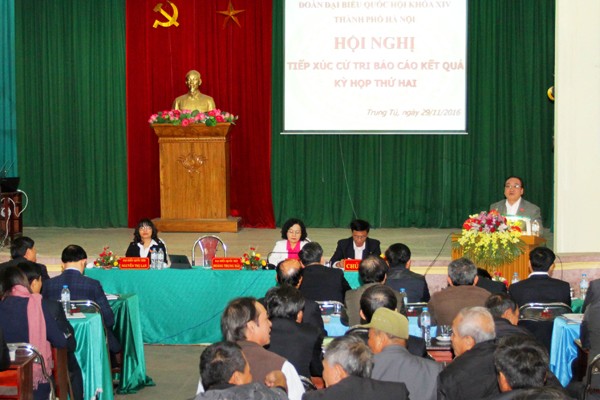 Tại buổi tiếp xúc, nhiều ý kiến cử tri đề cập đến vấn đề ô nhiễm môi trường, ô nhiễm nguồn nước đặc biệt là tình trạng ô nhiễm sông Nhuệ, sông Đáy chảy qua địa bàn huyện. Cử tri Nguyễn Hà Phương, xã Đồng Tân cho biết, nguồn nước sử dụng trong sinh hoạt của các hộ gia đình hiện chủ yếu là nước giếng khoan và giếng đào, nguồn nước không đảo bảo đảm do nhiễm nhiều tạp chất, hàm lượng kim loại nặng ảnh hưởng đến sức khoẻ, cuộc sống của người dân. Cử tri kiến nghị Thành phố có kế hoạch rà soát, kiểm tra và xây dựng nhà máy cung cấp nguồn nước bảo đảm vệ sinh môi trường tại địa bàn dân cư.