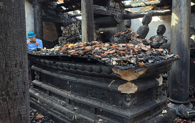 | Toàn bộ cột bị đã cháy bề mặt. Hoành, rui, các cấu kiện vì mái, hệ thống cửa bị cháy toàn bộ. Chân tảng bị bong vỡ, hư hỏng hết. Kết cấu công trình đã rất yếu không còn khả năng chịu lực (ảnh: BVH) |