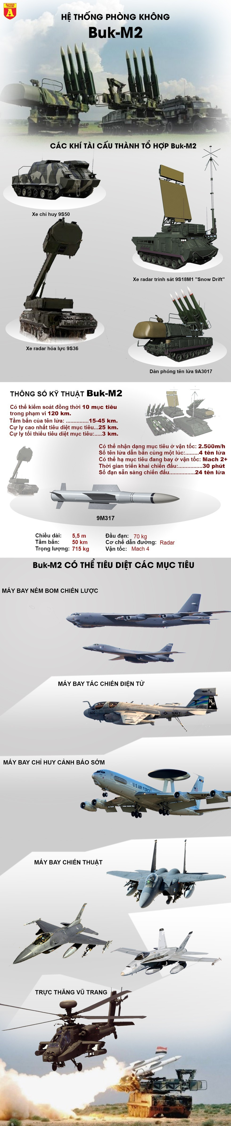 Tổ hợp Buk-M2 là phiên bản xuất khẩu của hệ thống tên lửa chiến trường nổi tiếng Buk, có khả năng tiêu diệt hầu như tất cả các loại máy bay, từ cường kích chiến trường đến tiêm kích chiếm ưu thế trên không, máy bay ném bom chiến lược hạng nặng.