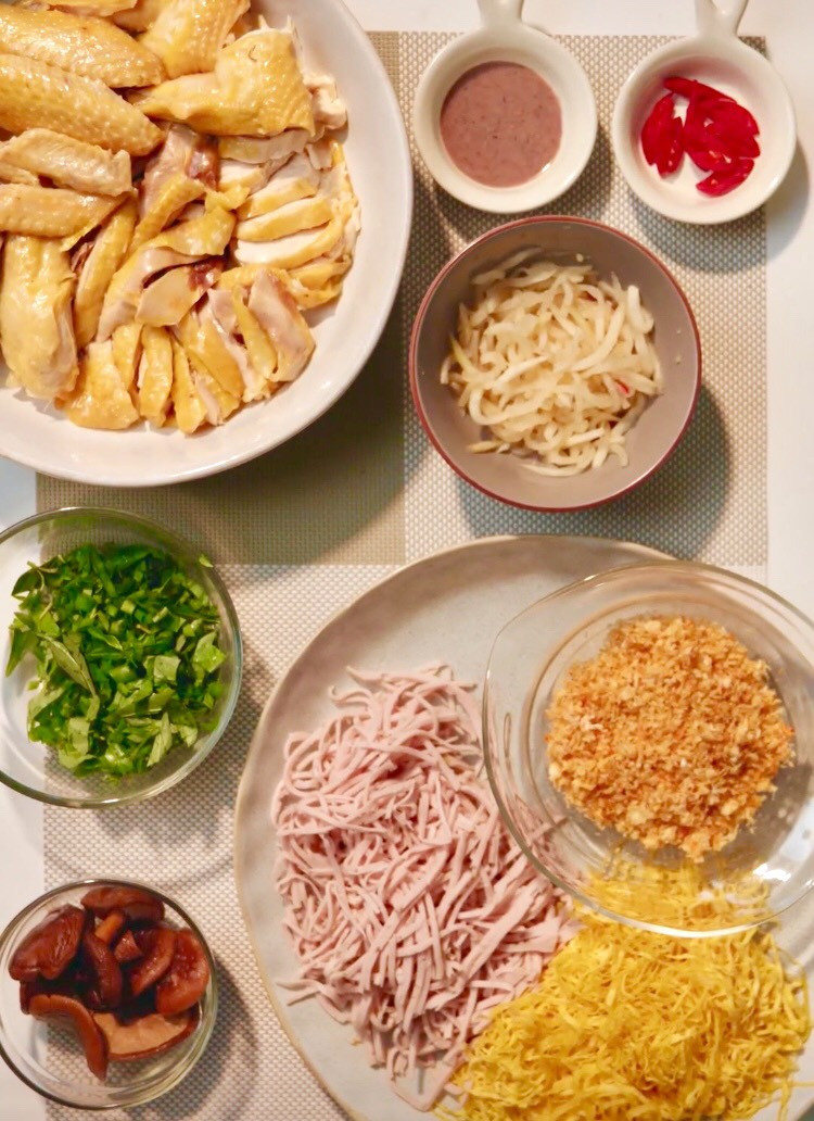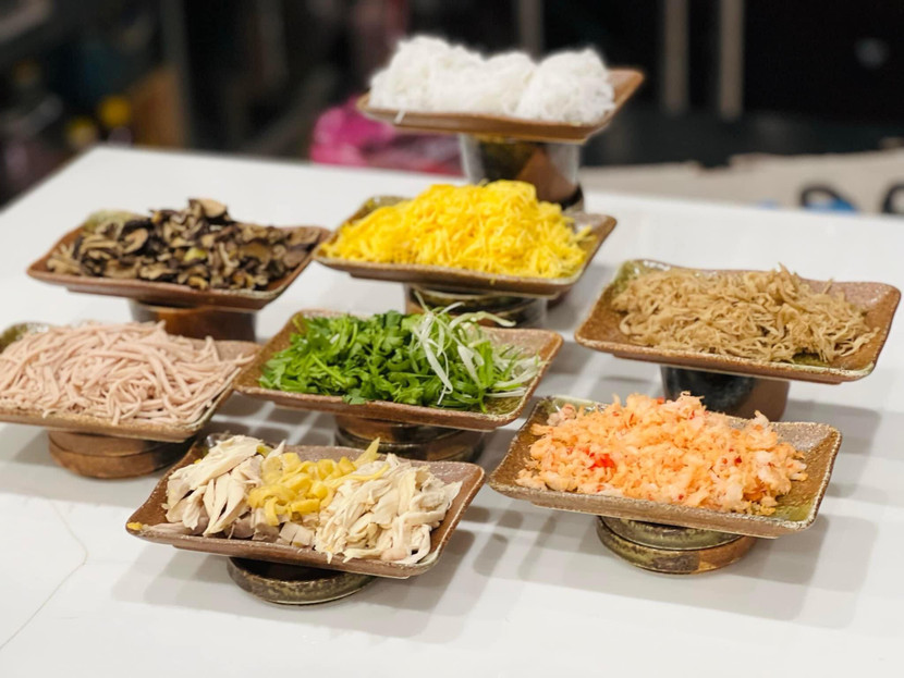 Giò lụa thì thái từng lát mỏng, sau đó xếp chồng lên nhau, mà thái sợi sao cho sợi nào sợi nấy đều vuông vức. Ấy nhưng thái giò mới chỉ là khâu đơn giản, tráng trứng rồi thái trứng mới cần đến kỹ thuật “thượng thừa” của các cô. Trứng gà sau khi bỏ bớt vài cái lòng trắng sẽ được đánh tan với chút nước và rượu thơm, lọc qua cái rây cho hết lợn cợn rồi đem rán trên chảo được quết một lớp mỡ mỏng, trứng phải được tráng thật là mỏng. Trứng tráng thành nhiều mẻ, tráng xong mỗi mẻ là úp lên lưng chiếc rá vo gạo bằng tre cho khô. Khi trứng nguội thì cuộn chặt lại, kiếm con dao thật sắc thái từng lớp thật mỏng, càng mỏng thì trứng càng rối đẹp.