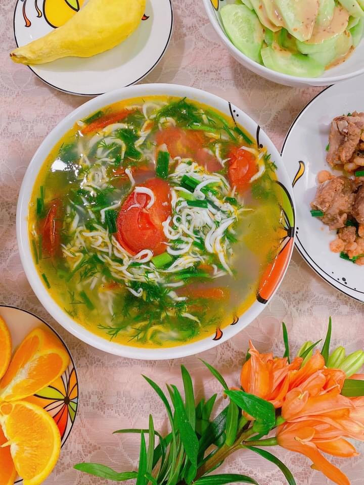 Nhắc đến món ngon từ cá ngần, đầu tiên phải kể tới món canh chua. Cá ngần sơ chế không quá mất thì giờ, chỉ cần ngâm với nước muối loãng độ 15 phút rồi vớt sạch những lợn cợn là xong. Canh chua cá ngần thường nấu với dứa. Dứa thái lát mỏng xào cà chua và hành khô (hoặc đầu hành phi thơm), nêm thêm gia vị như những món canh bình thường, thêm chút nước hầm xương lại càng ngon. Khi nước sôi thì bỏ cá vào, thêm chút mẻ (hoặc dấm bỗng) cho dậy mùi, đun liu riu lửa độ 5 - 10 phút là bắc xuống, thêm hành lá, thìa là thái nhỏ là có tô canh chua hấp dẫn. Canh chua cá ngần ăn với cơm hoặc chan với bún cũng được. Vị chua thanh kết hợp với mềm ngọt của cá rất dễ ăn. Ngoài ra, người ta có thể nấu canh chua cá ngần với dưa lá sắn hoặc măng chua, ăn bùi ngậy và cũng rất thơm.