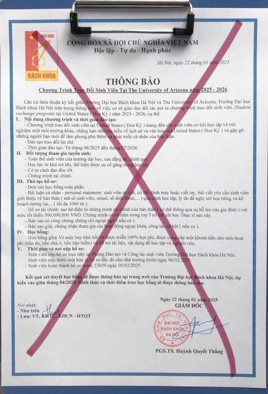 Đại học Bách khoa Hà Nội vừa lưu ý sinh viên và phụ huynh về tình trạng giả mạo con dấu của nhà trường và chữ ký của Giám đốc Đại học. Theo đó, đối tượng tung lên mạng xã hội thông tin về chương trình trao đổi sinh viên của Đại học Bách khoa Hà Nội với một trường ĐH ở Mỹ.