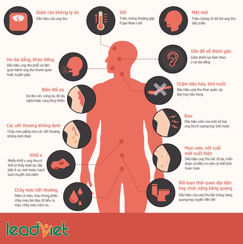 Mệt mỏi là dấu hiệu cho thấy cơ thể đang gặp rắc rối. Khi các tế bào ung thư phát triển và sinh sản, cơ thể bạn bắt đầu cảm thấy mệt mỏi với những thay đổi bất thường. Mệt mỏi là triệu chứng phổ biến của hầu hết loại ung thư khác nhau. Hãy đi khám bác sĩ nếu bạn bị mệt mỏi quá mức dù ngủ đủ giấc. Giảm cân đột ngột mà không biết lý do cũng là triệu chứng phổ biến của các loại bệnh ung thư. Nếu bạn nhanh chóng giảm cân mà không thay đổi chế độ ăn uống hay tập thể dục, thể thao nhiều, hãy đến gặp bác sĩ để kiểm tra.