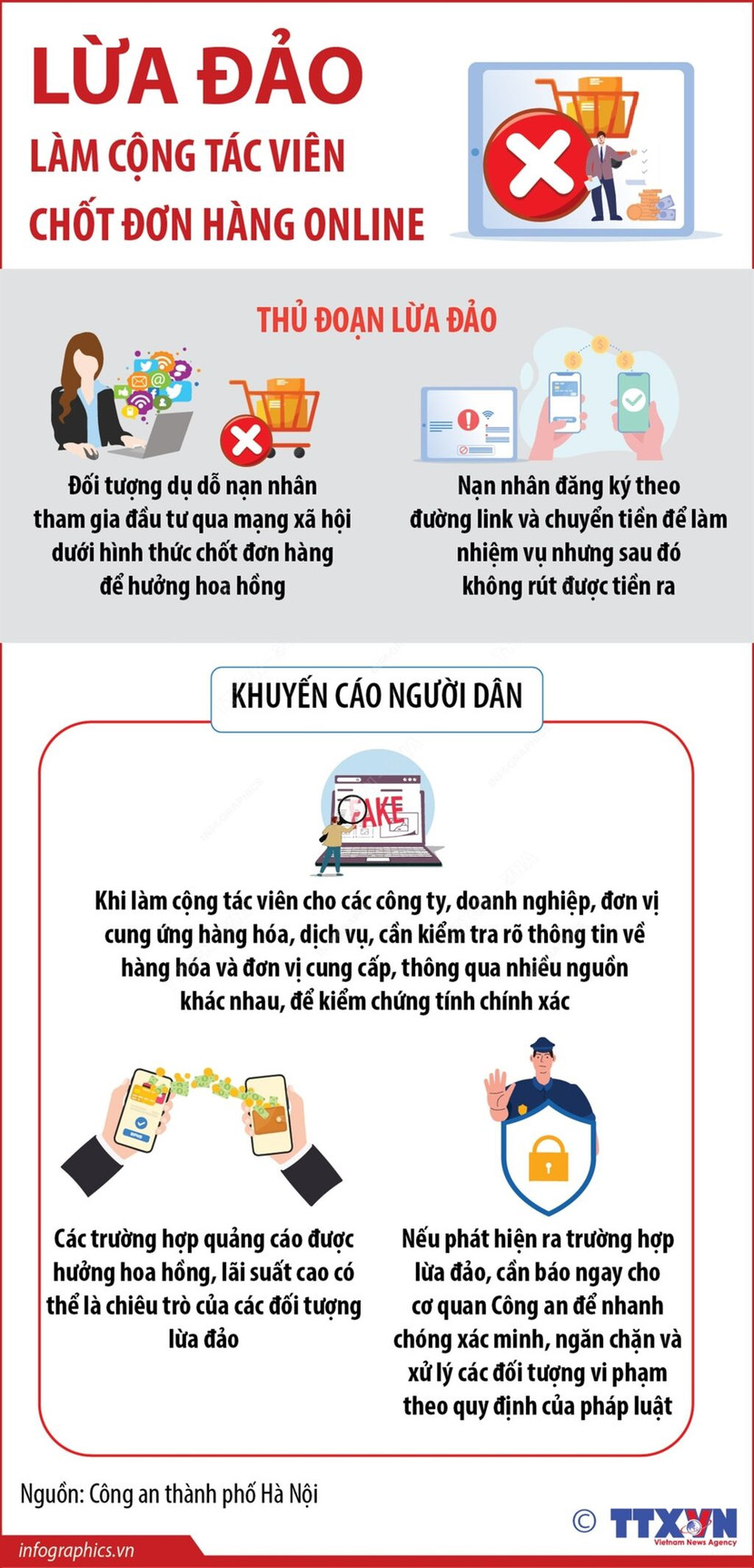 Theo cơ quan công an, thực tế thủ đoạn dụ dỗ nạn nhân làm cộng tác viên chốt đơn hàng online không mới và đã được các cơ quan chức năng cảnh báo nhưng vẫn có nạn nhân bị chiếm đoạt tiền bởi thủ đoạn này.