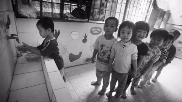 Để tiết kiệm nước các cháu chỉ được sử dụng 1 vòi nước và phải xếp hàng