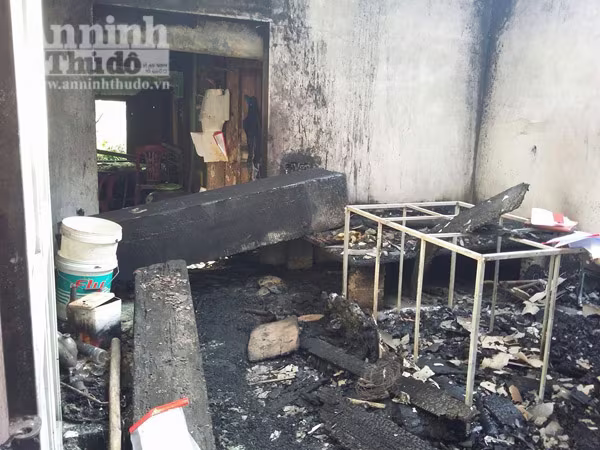 Tại hiện trường cho thấy đồ đạc, vật dụng trong nhà bị cháy rụi, mái bro xi măng hư hỏng nặng.