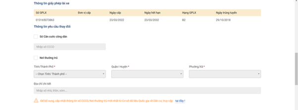 Tại phần Thông tin yêu cầu thay đổi, người dân muốn cập nhật CCCD mới hoặc địa chỉ thường trú thì cập nhật vào ô trống. Nếu không cần thay đổi, người dân bỏ qua bước này.