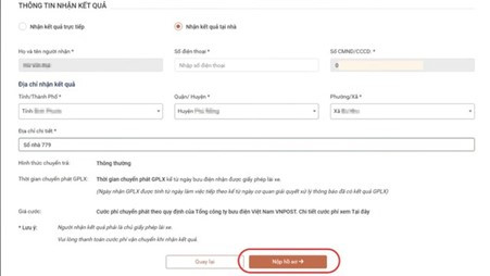 Bước 9: Tại phần Thông tin kết quả, người dân chọn Nhận kết quả tại nhà và điền thông tin theo hướng dẫn sau đó nhấn "Nộp hồ sơ".